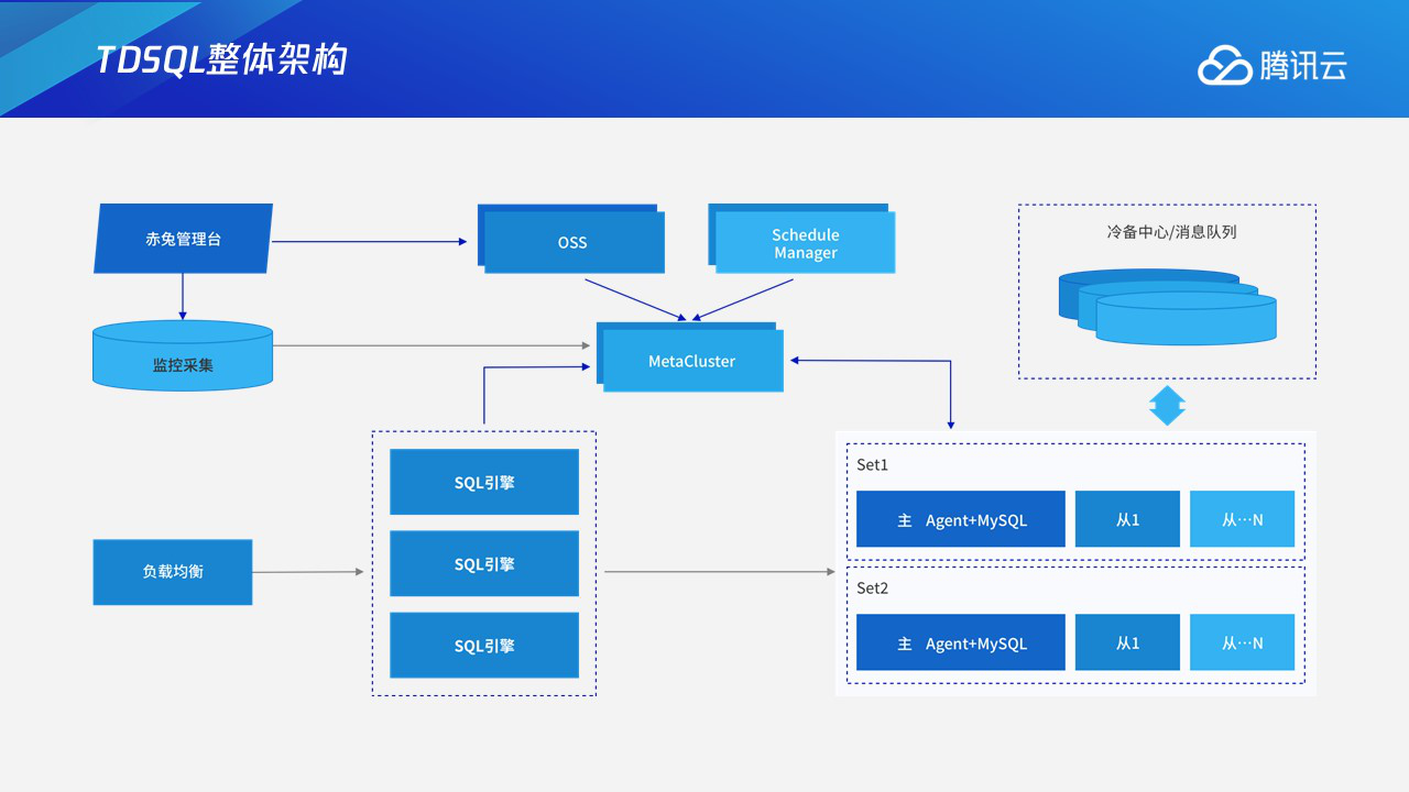 首先看TDSQL的架构。TDSQL简单来说包含几部分: