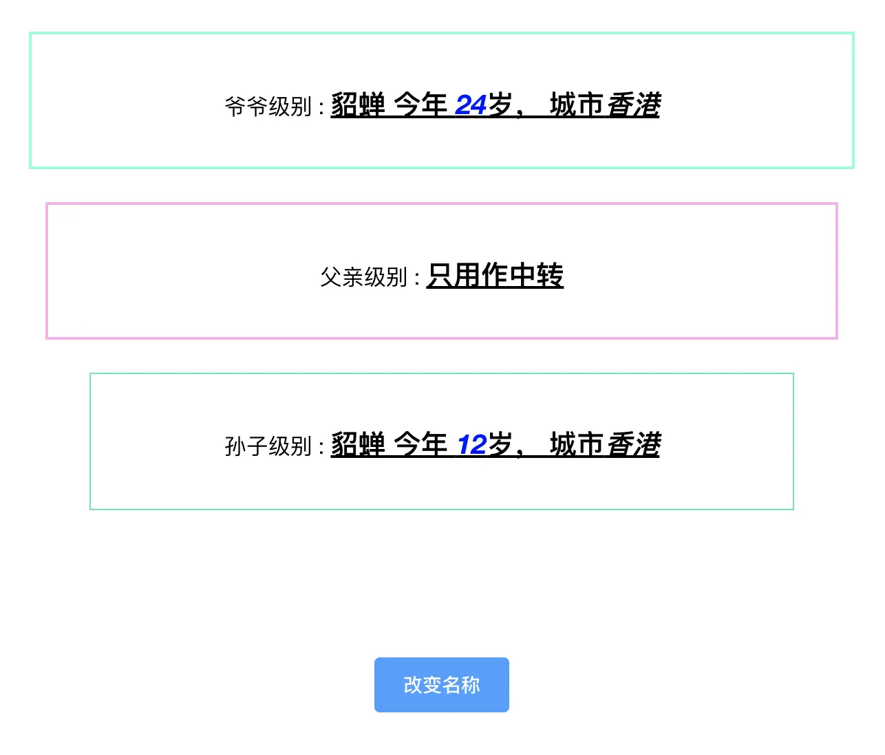 孙子级别 : <strong>{{ nameObj.name }} 今年 <i class="blue">{{ age }}</i>岁, 城市<i class="yellow">{{ city }}</i></strong>