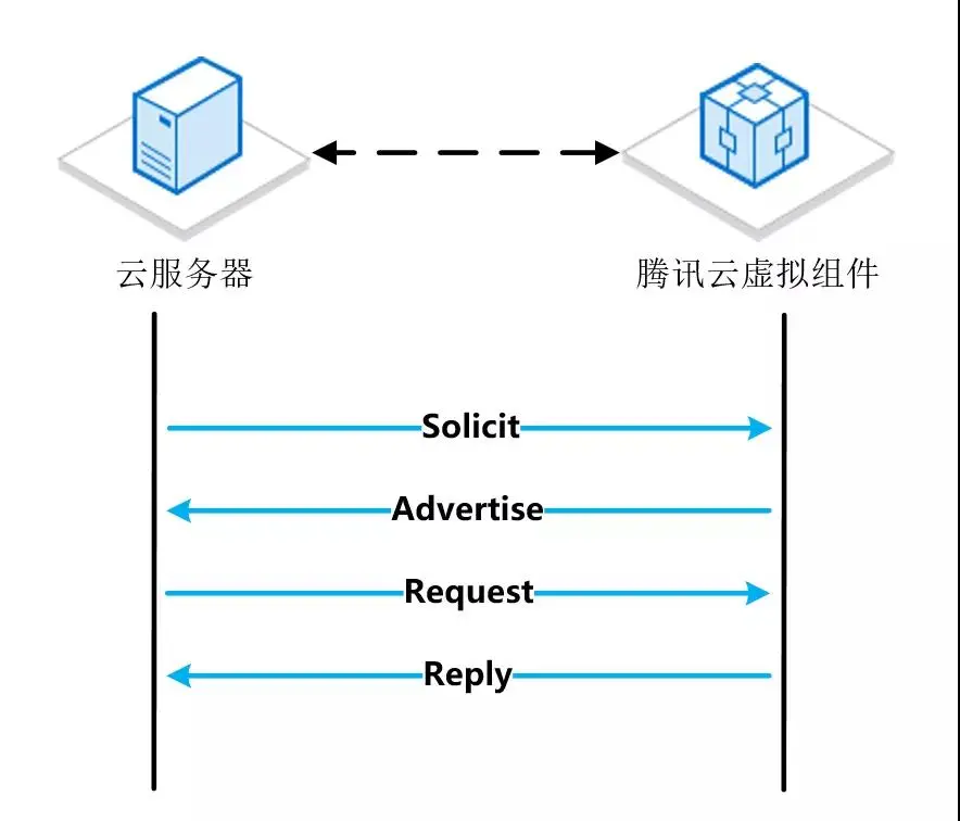客户端CVM(云服务器)发送Solicit报文来发现 DHCPv6 服务器,并请求DHCPv6 服务器(腾讯云虚拟组件)为其分配 IPv6 地址和网络配置参数。