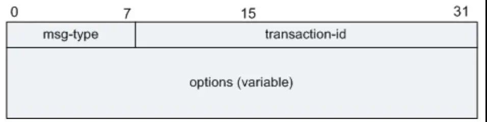 transaction-id:长度24比特,表示 DHCPv6 客户端随机生成的交互ID(服务端发起的报文交互ID为0),用来标识一次来回交互的 DHCPv6 报文。例如Solicit/Advertise报文为一次交互,Request/Reply报文为另外一次交互,两者有不同的交互ID。