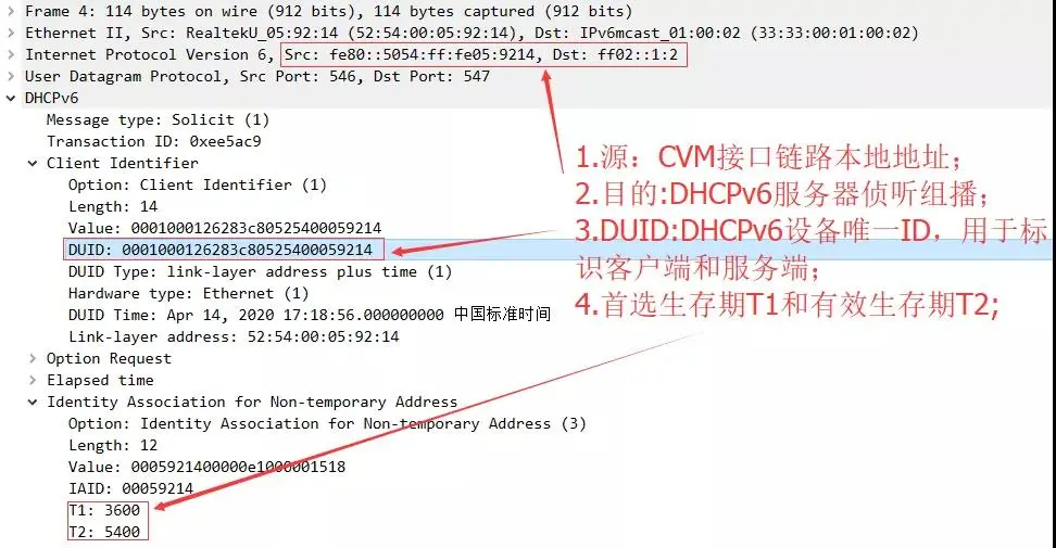 Solicit报文中携带了客户端的DUID、需要请求的非临时地址、以及其他网络配置参数等信息。