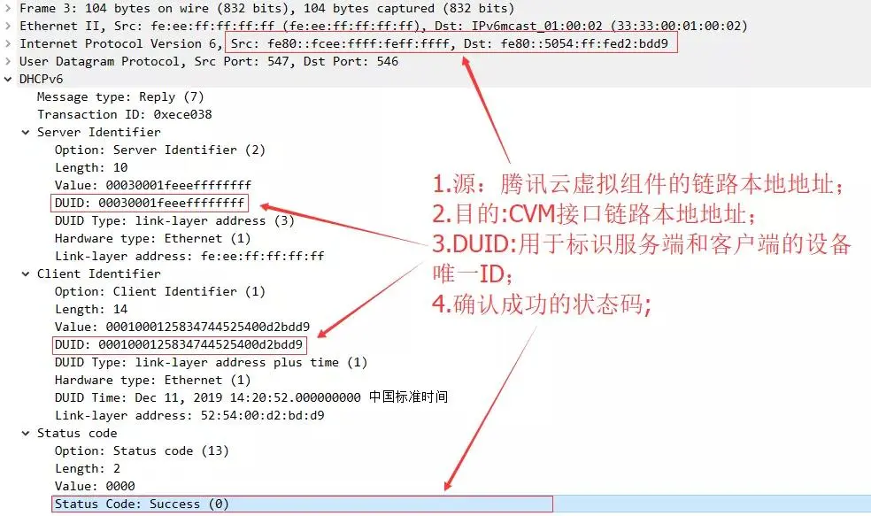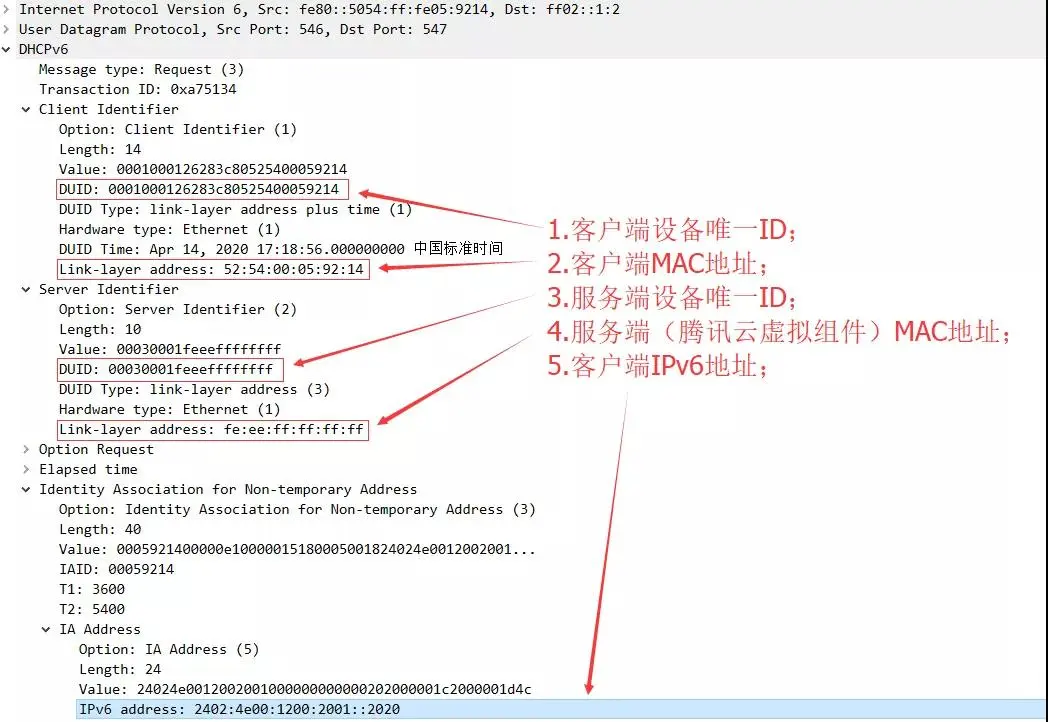 CVM首次接入腾讯云 IPv6 网络,通过 DHCPv6 自动获取 IPv6 地址的交互报文如下所示: