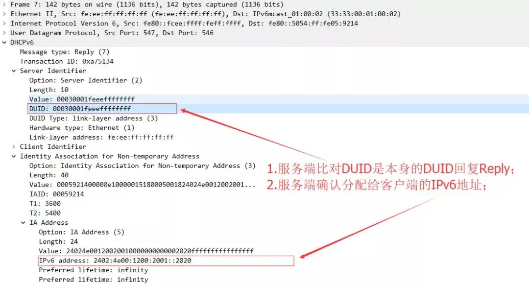DHCPv6 服务器发送携带了地址和配置信息的Reply消息来回应从 DHCPv6 客户端收到的Solicit、Request、Renew、Rebind报文。