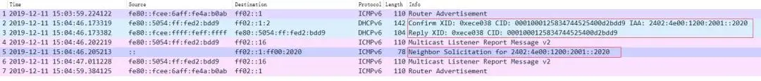 Advertise报文里面携带了服务器的DUID、客户端的DUID、分配给客户端的IPv6地址及租期等信息。