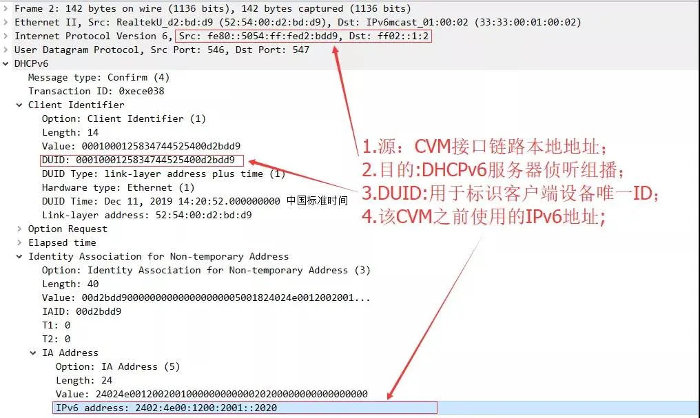 第一步,当客户端CVM(云服务器)非首次接入 IPv6 网络时(比如重启、网卡禁用后再启用等),CVM会通过组播地址:FF02::1:2,发送Confirm报文确认该CVM之前的IPv6地址是否仍然可用。