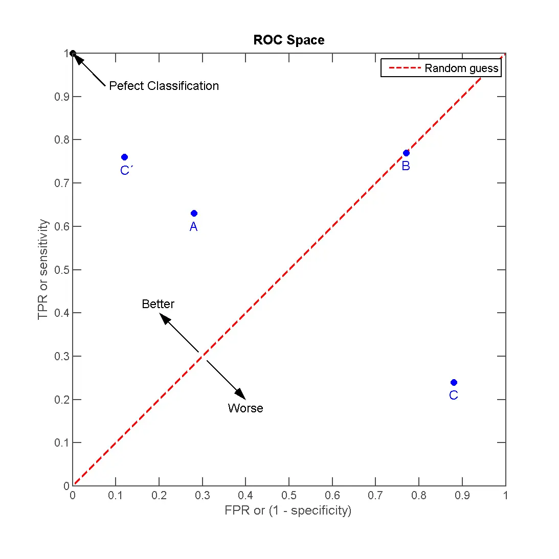 从 (0, 0) 到 (1,1) 的对角线将ROC空间划分为左上/右下两个区域,在这条线的以上的点代表了一个好的分类结果(胜过随机分类),而在这条线以下的点代表了差的分类结果(劣于随机分类)。