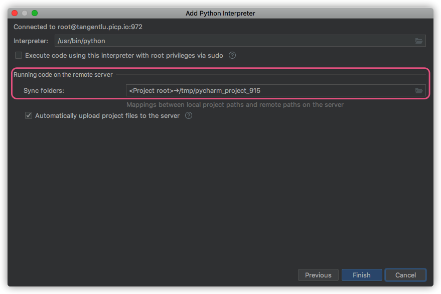 ssh interpreter,把sync folders设置正确即可.