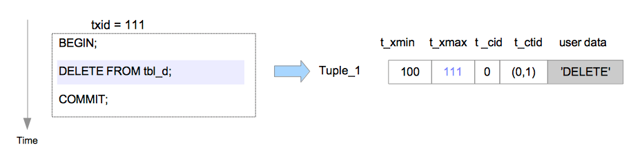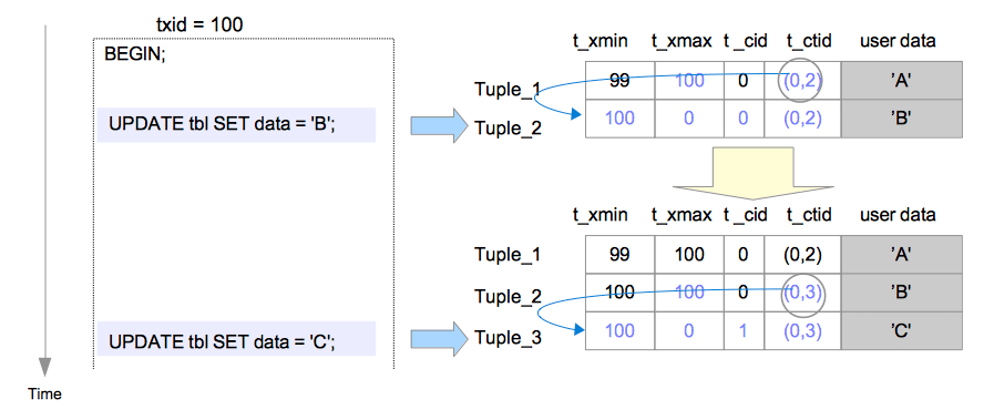 - Tuple_3的t_cid被设置为1,因为这是事务100中执行的第二条命令,在它之前已经执行过了一条命令