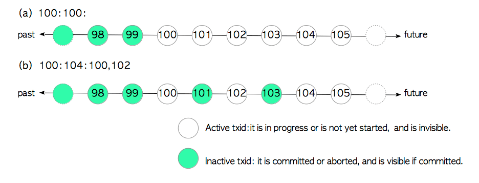 一个基本的活跃事务链表由三部分组成:xmin:xmax:xip_list,可以在执行事务中通过如下命令查看: