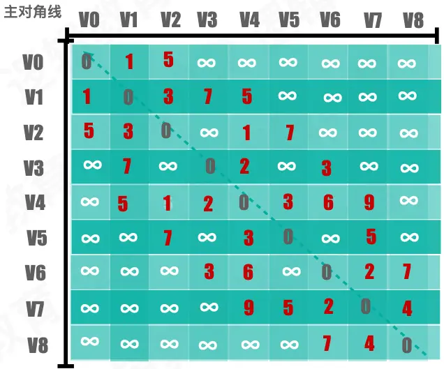 因此,我们可以修改V0 到V2 的权重为4,路径为 V0 -> V1 -> V2,但是我们并不能直接修改 邻接矩阵,