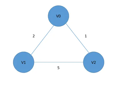我们知道,从 V0 到 V1 的权重是 1,V0到V2的权重是5,V1到V2的权重是3,