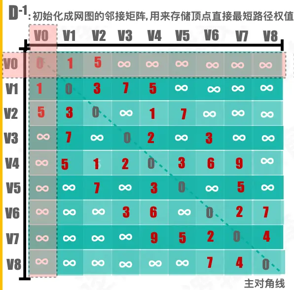 那么我们可以定义一个 邻接矩阵 D,代表顶点到顶点的最短路径的矩阵