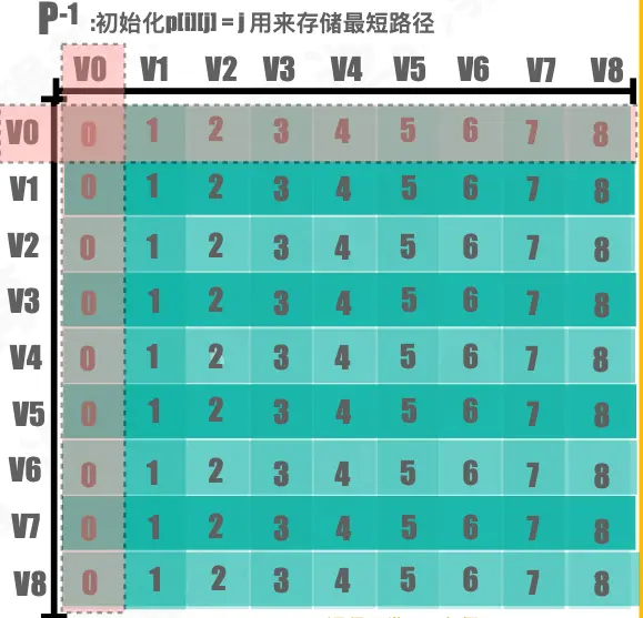 同时,定义一个 二维数组P,代表对应顶点最短路路径的前驱矩阵,