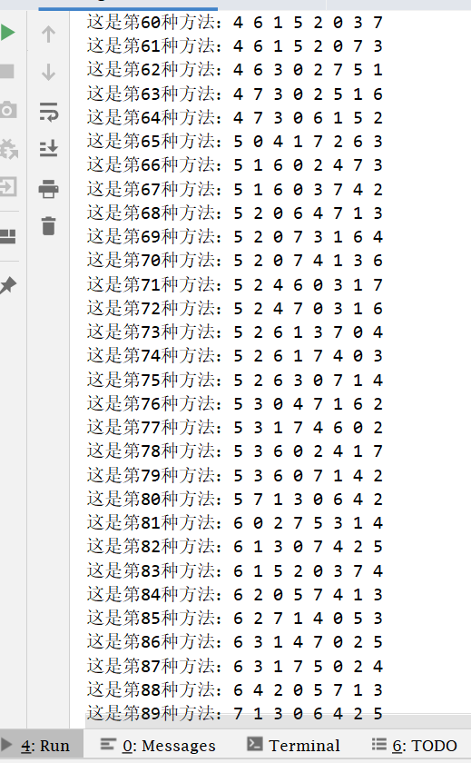 - putQueen(int n) 该方法为递归的调用放置皇后的方法,若出现冲突则回溯。