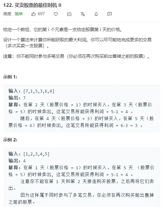 对于多次买卖问题,因为不存在同时存在多笔交易,即不可以持有股票的同时继续买入。一次遍历同样可以解决:首先找到谷值,再找到峰值卖出,继续进行谷买入,峰卖出的操作,需要理解一个数学问题:遇到谷就买入,遇到峰才卖出是可以实现最大收益的。