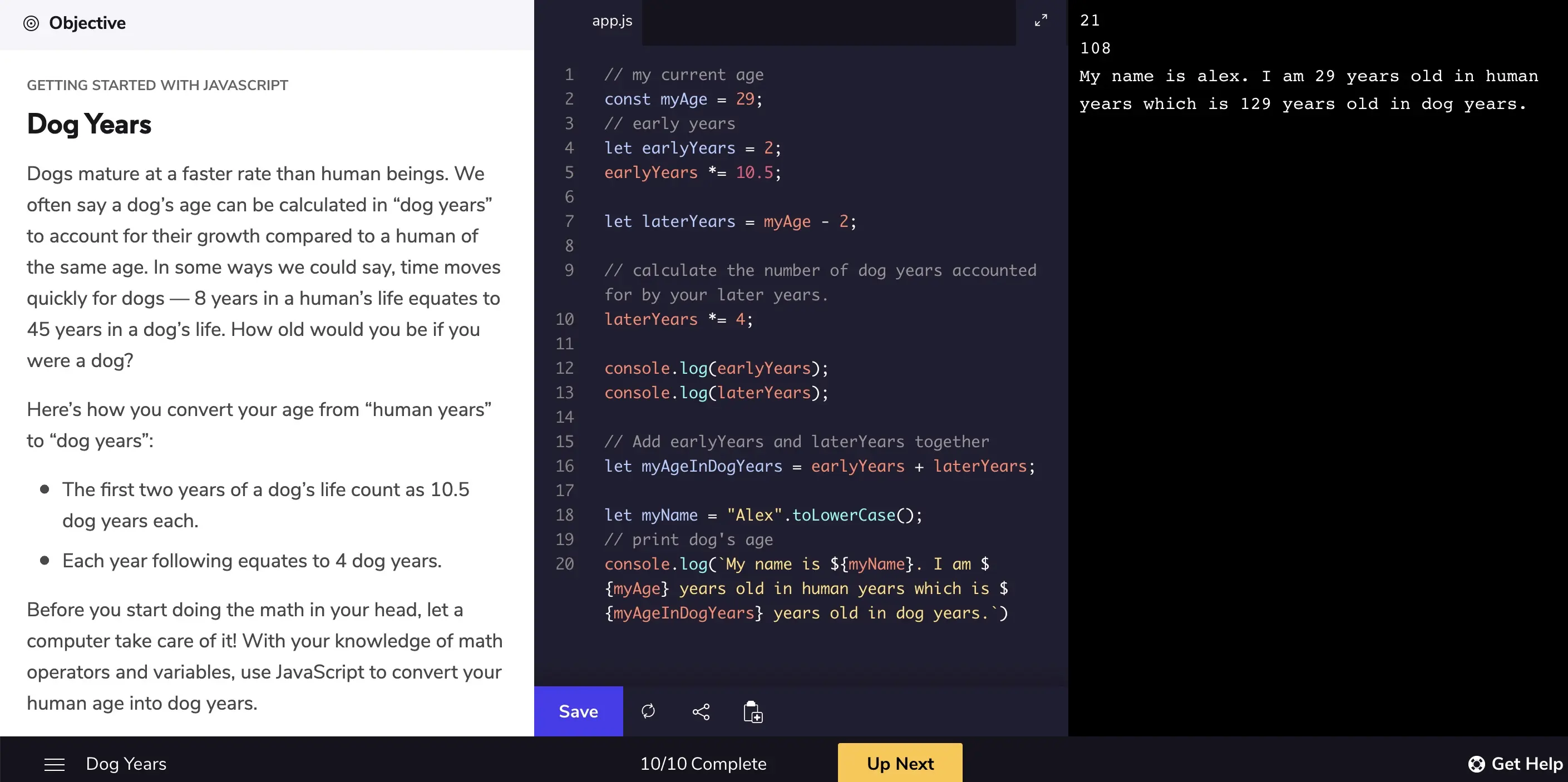 console.log( My name is ${myName}. I am ${myAge} years old in human years which is ${myAgeInDogYears} years old in dog years. )