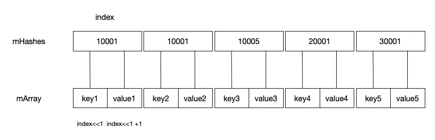 Object[] mArray; //存储key-value对的数组,大小是mHashes的两倍