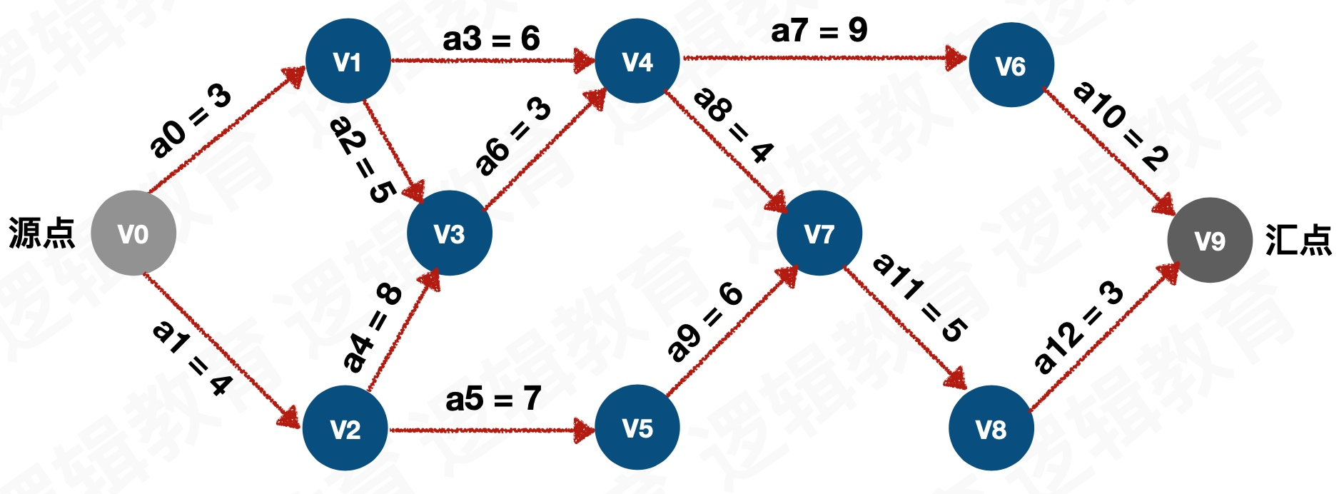 ltv(latest time of vertex): 即顶点Vk 的最晚发生时间,也就是每个顶点对应的事件最晚需要开始的时间,超出此时间将会延误整个工期; - 活动的最早开工时间