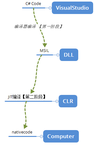 这种问题要怎么挖呢? 我在之前的文章也聊过,C#代码到机器码中间有两个编译过程,一个是csc编译后的IL代码,一个是jit编译后的native代码,所以搞懂IL代码和native代码就是我们要深究的方向,我还是把那篇文章的图拿过来。