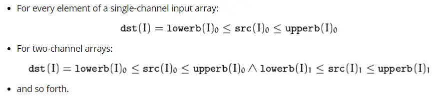 src – first input array. 输入矩阵(图像) lowerb – inclusive lower boundary array or a scalar.阈值下限 upperb – inclusive upper boundary array or a scalar.阈值上限 dst – output array of the same size as src and CV_8U type.输出和src相同的矩阵 对于通道的处理