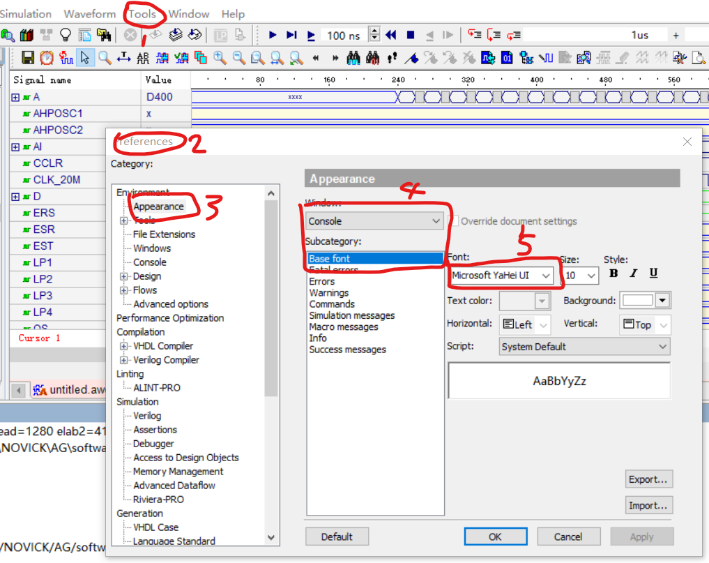 Active-HDL 10.5终端显示中文 元一把 2020-05-14 262 阅读1分钟 Active-HDL 10.5,默认的设置是显示不出中文字符的(这个与个人电脑的设置有关),一般中文字体是乱码的原因是默认字体不支持中文字符,换一个支持中文字符的字体即可.如还是显示不正常就要把Script中的编码设置与你的电脑的编码设置一致.