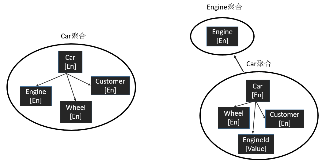 因此我们考虑把发动机作为一个单独的业务域,Car聚合里面只需要记录EngineId。无论是发动机的运行数据或者发动机的监控、升级等操作,都由发动机自己负责。同时因为Car聚合记录了EngineId,必要的情况下我们可以方便的从EngineRepository中获得Engine对象,这也算是做到了懒加载。可以想象,系统中假如存在千万级别的Car实例,按照最初的方案就会有千万级别的Engine对象,但是我相信并不是每一次对Car实例的调用都需要获取其Engine信息,这就造成了大量的内存消耗。相对于最初的方案,我们的聚合或更小,也更灵活。