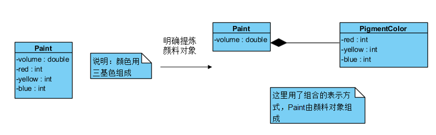 比如某车辆养护机构提供喷绘功能,用户基于三原色自由组合自己喜爱的颜料。我们定义了Paint对象,其颜色由red、yellow、blue构成。在这里“颜色”是一个非常重要的概念。你可以想象某种网红流行颜色必然会被大家追捧,在这段期间频繁地被系统创建出来。通过前面的论述,我们试着显示定义PigmentColor专门用于三原色的管理。其本身也会作为一个值对象被Paint使用。