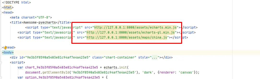 还有一点, pyecharts 的所需要的静态资源,会默认访问 assets.pyecharts.org/ 获取(可以查看生成的 html 文件):