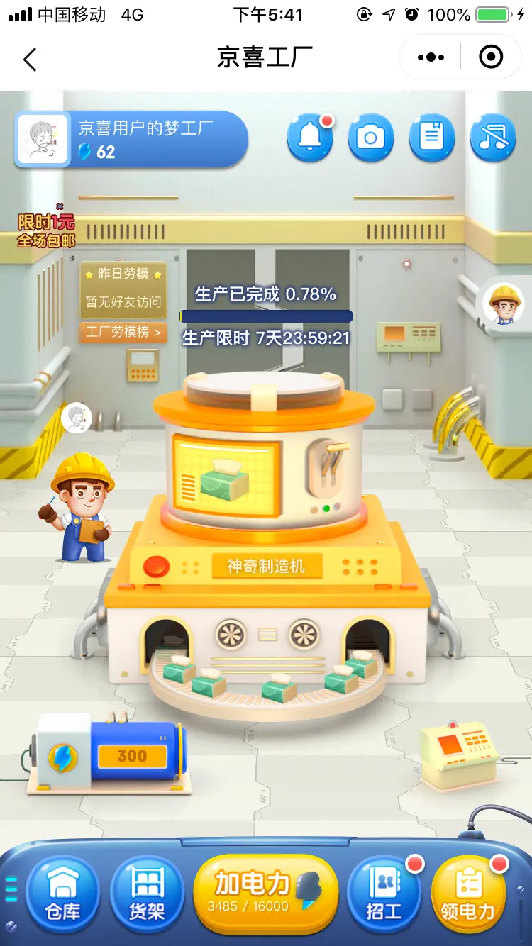 今年Q1(2020年第一季度)参与了京喜事业部「京喜工厂」业务的前端开发。用户可以通过「京喜工厂」参与口罩、抽纸、大米等商品的“在线生产”,既能趣味造物,又能免费领奖品。目前可以通过「京喜」小程序首页访问该活动。