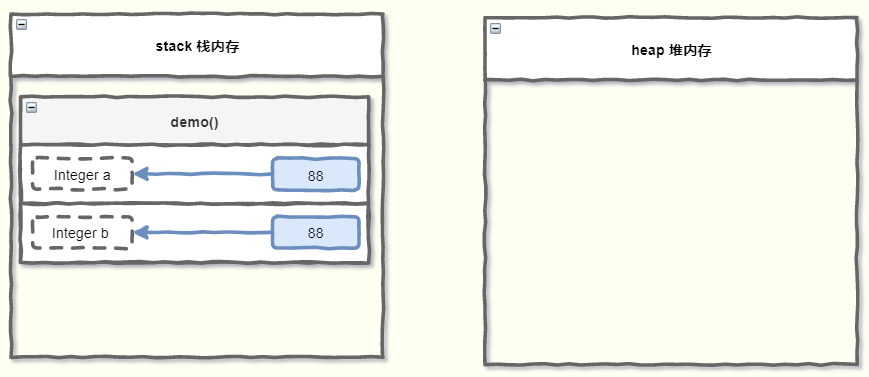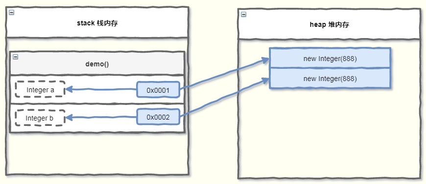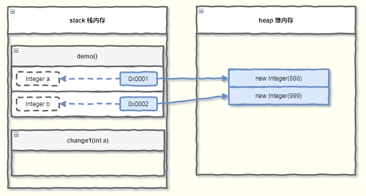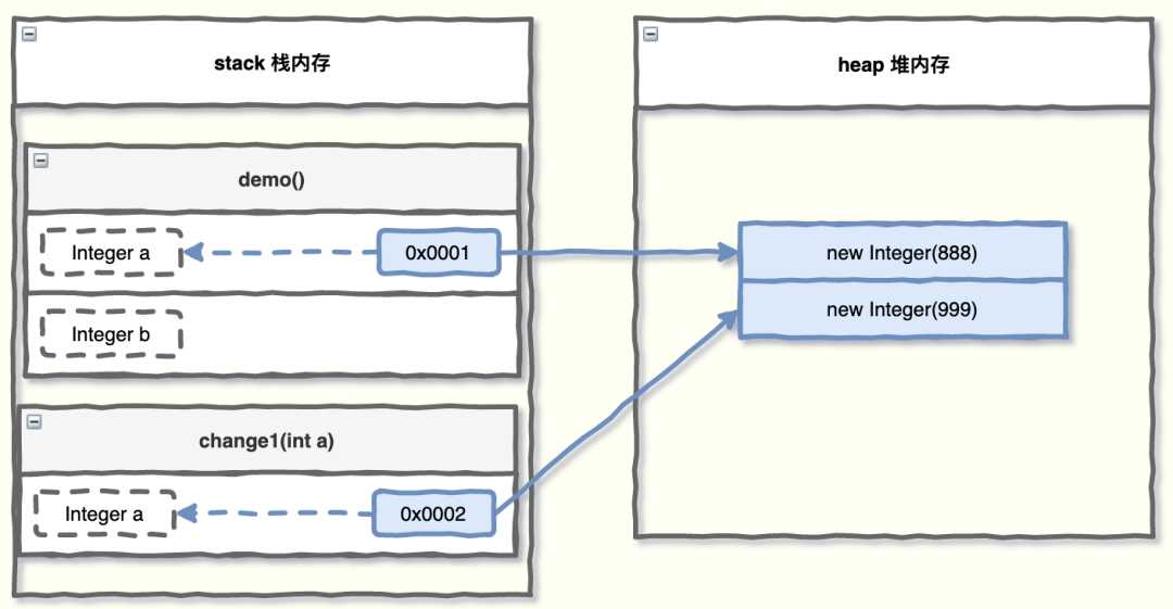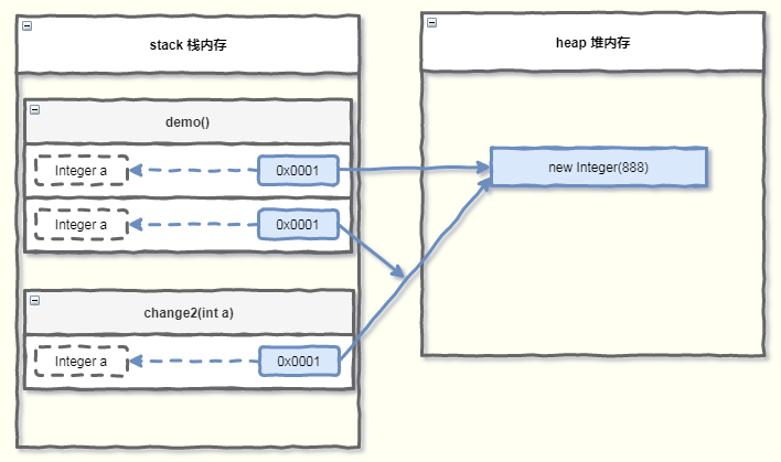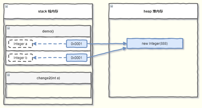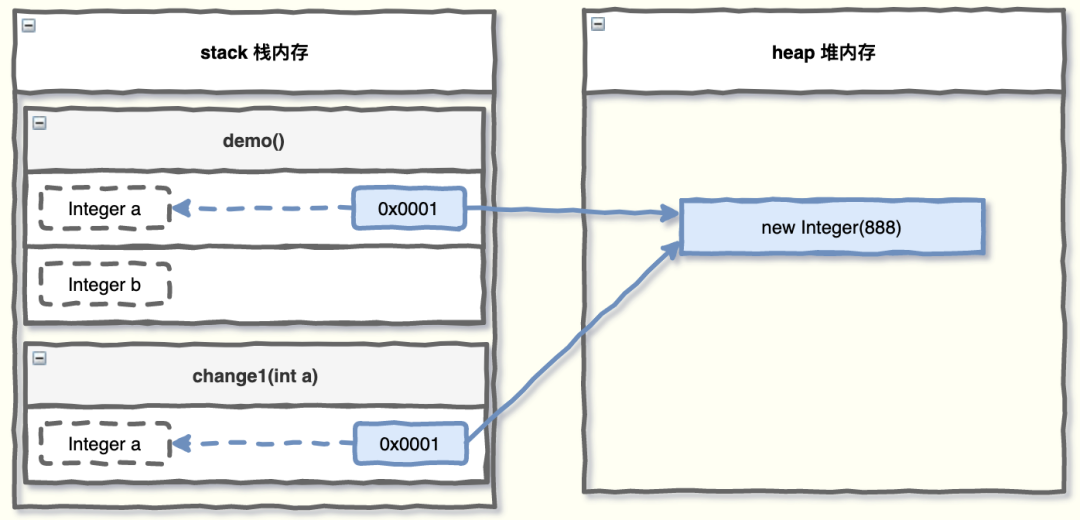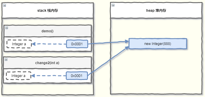 此时的内存布局如下图所示,实参 a 指向的地址值,就是new Integer(888) 的地址。