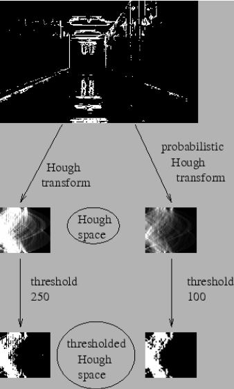 内容来自OpenCV-Python Tutorials 自己翻译整理 目标: 理解概念 在图片中检测直线 学习函数cv2.HoughLines(),cv2.HoughLinesP() 原理: 霍夫变换在检测各种形状的技术中十分流行,如果能用数学表达式写出图形的公式,就可以使用霍夫变换来进行检测。 直线的表达式为<span class="MathJax" id="MathJax-Element-714-Frame" tabindex="0" data-mathml="y=mx+c" role="presentation" style="box-sizing: border-box; outline: 0px; display: inline; line-height: normal; text-align: left; word-spacing: normal; word-wrap: normal; white-space: nowrap; float: none; direction: ltr; max-width: none; max-height: none; min-width: 0px; min-height: 0px; border: 0px; word-break: break-all; position: relative;">y=mx+cy=mx+c或者用极坐标表示为,<span class="MathJax" id="MathJax-Element-715-Frame" tabindex="0" data-mathml="ρ=xcosθ+ysinθ" role="presentation" style="box-sizing: border-box; outline: 0px; display: inline; line-height: normal; text-align: left; word-spacing: normal; word-wrap: normal; white-space: nowrap; float: none; direction: ltr; max-width: none; max-height: none; min-width: 0px; min-height: 0px; border: 0px; word-break: break-all; position: relative;">ρ=xcosθ+ysinθρ=xcosθ+ysinθ ρ表示从原点到直线的垂直距离,θ表示直线的垂线与横轴顺时针方向的夹角。  直线在原点下方,ρ是正值,角度小于180。直线在原点上方经过,角度不是大于180度,而是小于180度,但是ρ值取负值。垂直的时候角度为0,水平的时候角度为90度。 霍夫变换是如何实现的? 每条直线都可以用(ρ,θ)表示。 首先创建一个2D数组或者累加器(用来存储两个参数),初始化数组为0。行表示ρ,列表示θ。数组的大小决定了结果是否准确。如果要精度为1度,那么需要180列。 ρ值最大为图片对角线的距离。如果精度要求达到像素级别,那么行数应该等于图像对角线的长度。 如果有一个100×100的水平直线在图像中央(在第50行的位置)。取直线上第一个点(x,y),将点带入方程,遍历θ值从0到180.求出对应的ρ值,这样得到敌对(ρ,θ),如果该值再创建的2D数组(累加器)中的对应位置上也存在,那个该位置加1。所以累加器中位置(50,90)=1。(一个点可能在多条直线当中,所以一个点可能对应多个值加1)。取直线第二个点,重复上述过程。更新累加器中的值。此时(50,90)的值为2。对直线上每个点都按照这种方式操作,最后(50,90)的值肯定最大。这就说明有一条直线。 (注意上面能选取到直线上的点的原因是因为选取的图像边缘信息点) opencv中的霍夫变换 使用函数cv2.HoughLines(),返回(ρ,θ),ρ的单位是像素,θ是弧度。 输入参数:第一个参数是二值化图像,进行霍夫变换之前要进行二值化或者canny边缘检测。第二第三个参数代表ρ和θ的精度。第四个参数是阈值,只有当累加器中的值高于阈值时才被当成是直线。 img = cv2.imread('18.jpg') gray = cv2.cvtColor(img,cv2.COLOR_BGR2GRAY) edges = cv2.Canny(gray,50,150,apertureSize = 3) lines = cv2.HoughLines(edges,1,np.pi/180,200) for rho,theta in lines[0]: cv2.line(img,(x1,y1),(x2,y2),(0,0,255),2) cv2.imwrite('houghlines3.jpg',img) 上面的过程可以看到一条直线需要两个参数,这需要大量计算。概率检测是一种优化,它不是对每一个点都检测,而是在图像中随机选取点集合进行运算,检测直线足够用,但是要降低阈值。 参数为minLineLength表示直线长度的阈值,少于此长度的会被忽略。MaxLineGap两天直线的间隔,小于此值会被当成一条直线。