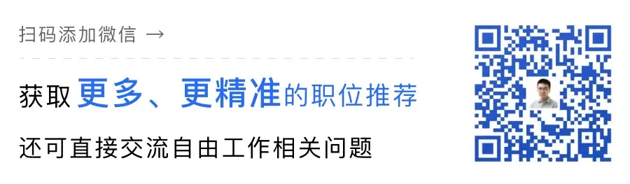 - 您也可以添加微信告诉我们你的职位需求,便于我们为大家提供更有效的职位推荐,谢谢~