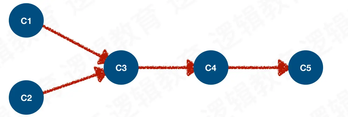 拓扑排序:求拓扑序列的过程即为拓扑排序。需要注意的是拓扑排序的结果不是唯一,如上图中所示,结果可以是C1->C2->C3->C4->C5,也可以是C2->C1->C3->C4->C5。