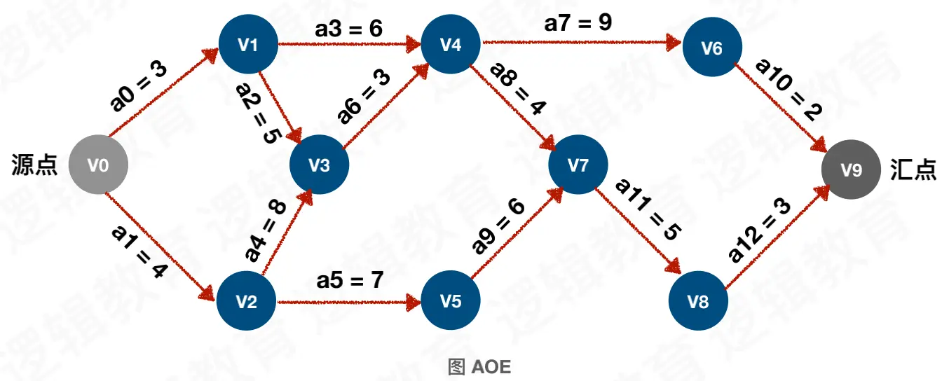 - AOE网:在一个表示工程的带权有向图中,用顶点表示事件,用有向边表示活动,用边上的权值表示活动持续的时间,这种用有向图的边表表示活动的网,我们叫做AOE网,如图