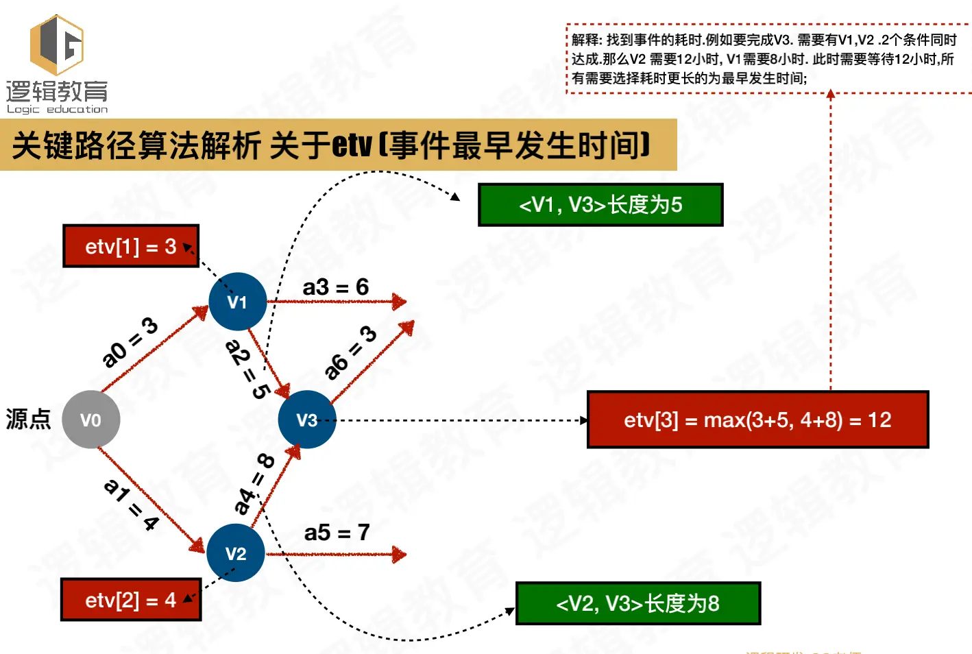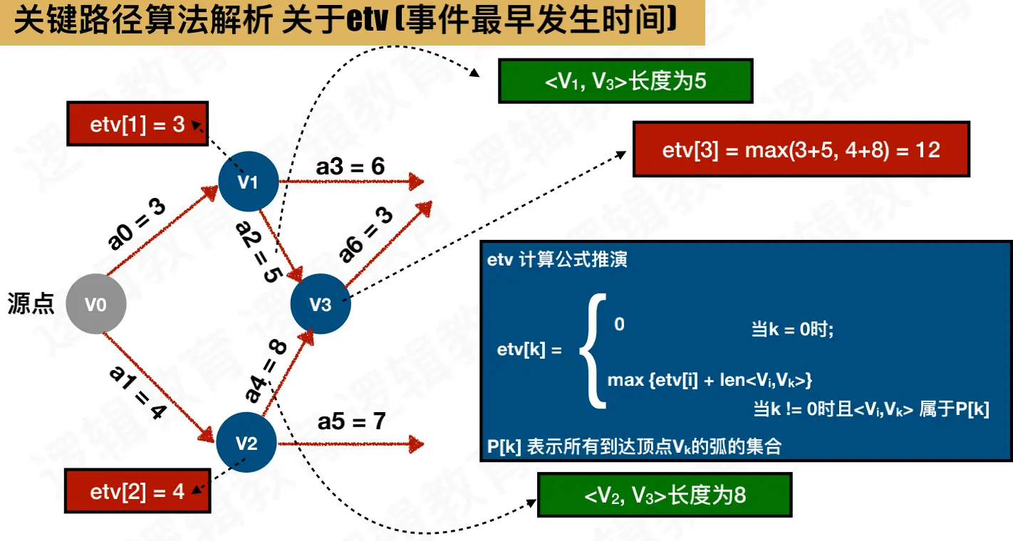 - 最早开始时间etv:就是求解AOV网的过程,需要记录每个顶点的最早开工时间,当有多个权值时取最大的那个,如图所示