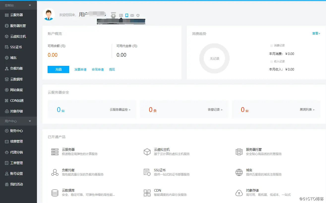 3.用户中心——用户控制台,用户的自主管理中心, 支持产品管理、订单管理、账号管理、安全设置等。