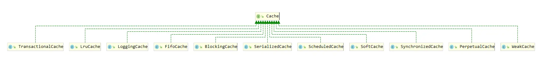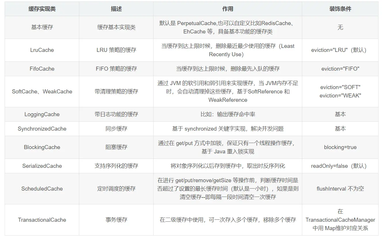 PerpetualCache在Mybatis是基础缓存,但是缓存有额外的功能,比如策略回收、日志记录、定时刷新等等,如果需要使用这些功能,那么需要在基础缓存的基础上进行添加,需要的时候添加,不需要即可不用添加。在缓存cache包下,有很多装饰器模式的类实现了Cache接口,通过这些实现类可以实现很多缓存额外的功能。