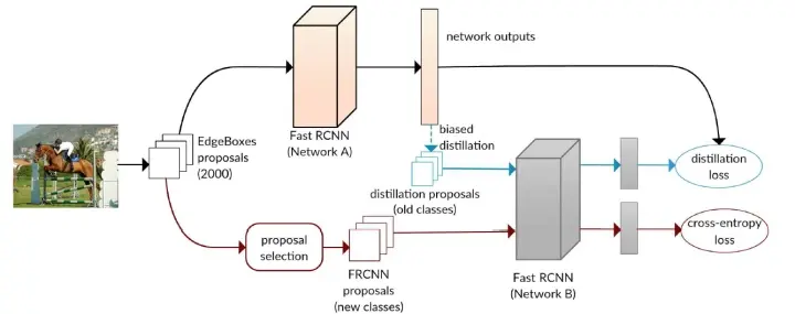 具体来说,该方法的模型设计如上图所示。本文中,为了保证候选的region proposal不是针对原有模型中特定的类别,而是针对通用的物体,方法的基本架构基于Fast RCNN。当更新模型的时候,需要两个版本的模型,其中上路的Network A为原始的模型(模型参数完全固定,不进行调整),下路的Network B为可以更新的模型。模型的整体流程如下: