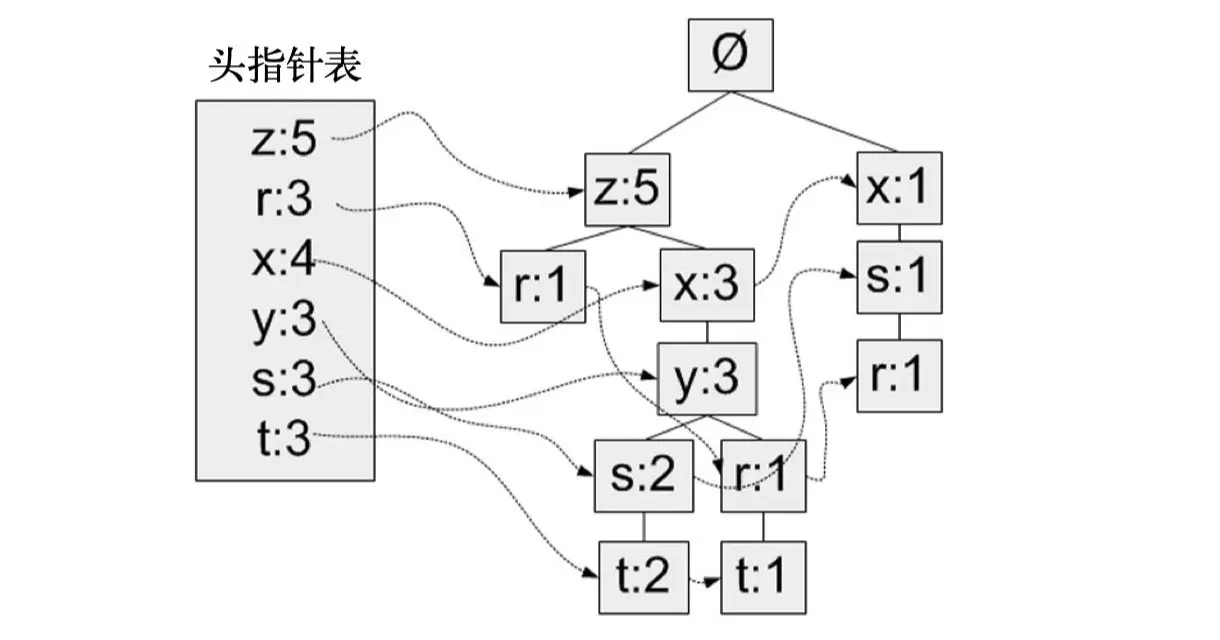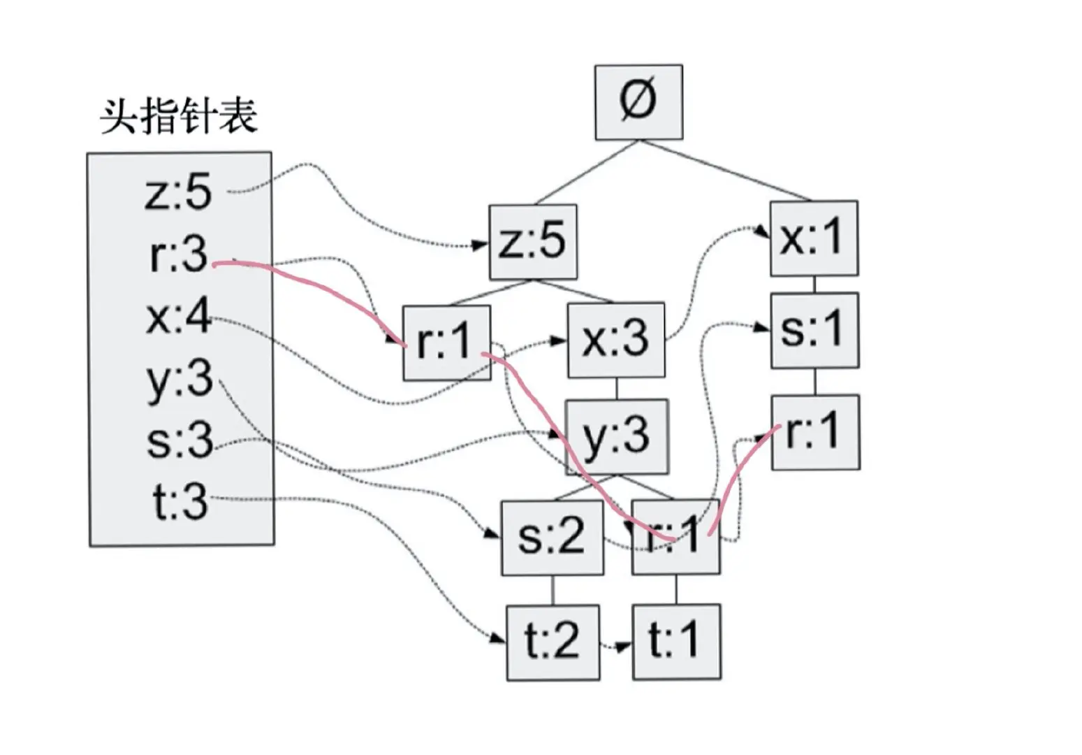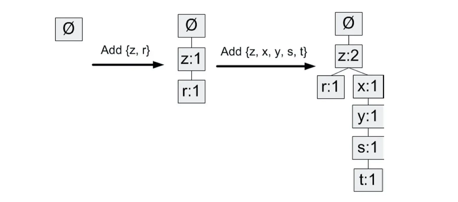 一开始的时候树为空,什么也没有,接着插入第一条数据{r, z}。由于z出现的次数大于r,所以先插入z再插入r,之后插入了一条{z,x,y,s,t},同样是按照整体出现的频次排序的。由于z已经插入了,所以我们将它出现的次数更新成2,之后发现没有重复的元素,那么就构建出一条新的分支。