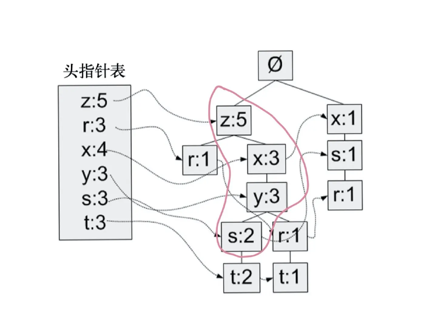 红框当中s的位置最低,所以整个链路上{z, x, y, s}在整个数据集当中出现的次数就是2,那么我们确定了s之后,通过向上FP-tree,就可以还原出所有包含s的频繁项构成的数据。