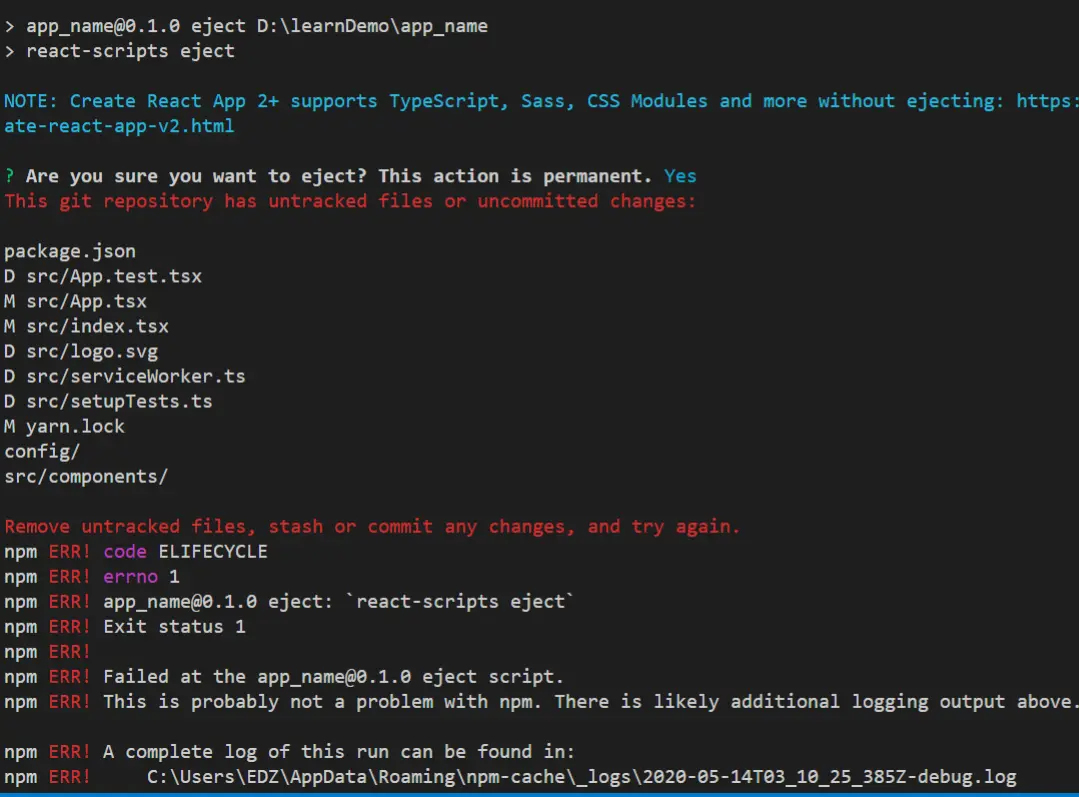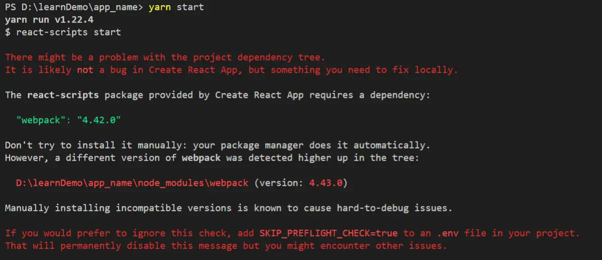 记:create-react-app安装webpack版本错误 切图小前端 2020-05-14 2,170 阅读1分钟 上面主要是说 webpack 版本冲突 不是create-react-app本身的问题,需要手动解决。 解决办法: npm run eject // 显示所有的依赖项 如果运行出现类似这样的报错 Are you sure you want to eject? This action is permanent 只要 git 操作一波就可以了 git init git add . git commit -m 'init' 再次执行 npm run eject 完美解决