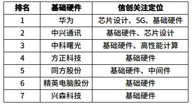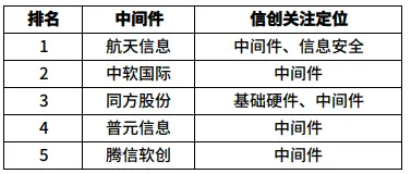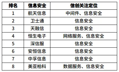 信息安全领域,上榜的信创企业共8家。其中,卫士通、天融信、恒生电子和美亚柏科4家企业都是“90后”,航天信息、深信服、安恒信息和中孚信息为“00”后,8家企业中,除天融信2016年从新三板摘牌外,其余7家均为上市公司。从排名情况看,航天信息、卫士通、天融信位列榜单前三。2019年,多家安全企业在信创领域取得不俗进展,航天信息年报披露截止2019年底,公司累计中标65个信创试点项目,且已获得39家部委、26个省市自治区的信创设计咨询业务;中孚信息2019年在主营业务方面迎来大爆发,净利润同比增长近2倍;安恒信息同样表现出色,2019年公司营收同比增长51%,经营活动产生净现金流增长126%。平安证券等多家券商研报称,国家安全可控战略快速推进,相关公司将持续受益于我国网络安全行业的高景气度。另外,值得关注的是,安全领域“元老级”企业360及和从360分离出来的、专注政企安全领域的奇安信,虽未在榜单中出实现,但其在安全细分领域拥有的高市场占有率仍是不容小觑的。华泰证券今年3月发布的一份研报显示,截至2018年年底,奇安信在安全内容管理和UTM两个硬件领域的市场占有率均达到13%,分别位列行业第二、第三名,终端安全软件领域,奇安信市场占有率达到22.9%,居行业首位。