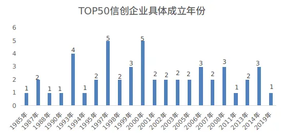 50家信创企业中,成立至今超过18年的共有31家,占总数量的62%。其中成立最早的是深科技,于1985年7月4日在深圳成立,1994年在深交所上市,专注的信创方向是芯片封测,事实上,深科技虽然成立时间较早,但在信创领域布局起步较晚,公开资料显示,2015年,深科技收购沛顿科技100%的股权,由此切入存储封测领域,截止目前,深科技在芯片封测领域的探索刚满5年。成立时间排在第二的是华为,1987年成立,总部位于中国广东省深圳市龙岗区,专注的信创方向包括芯片设计、5G和基础硬件,华为在芯片领域布局较早,1991年,创始人任正非从亿利达挖来了硬件工程师徐文伟,并由他组建了华为的集成电路设计中心,在徐文伟的主持下,华为成功开发了一款数据芯片SD502,华为芯片研发也由此拉开了序幕。和华为同一年成立的精英电脑股份,总部位于台湾省,1994年在台湾证券交易市场上市,专注的信创方向是基础硬件,2002年达到每月200万主机的销量,成为当时全球最高的主机板制造商之一。