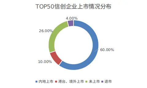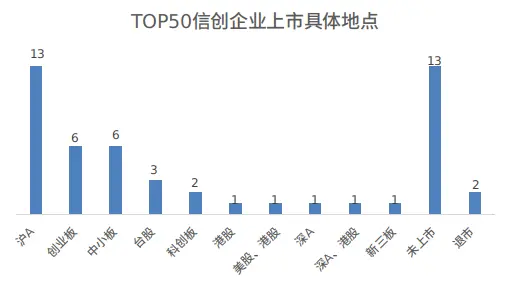 统计显示,上榜的50家信创企业中,有35家为上市公司,其中包括30家内地上市公司,5家港台、境外上市公司;有13家企业尚未上市;另有2家企业退市。