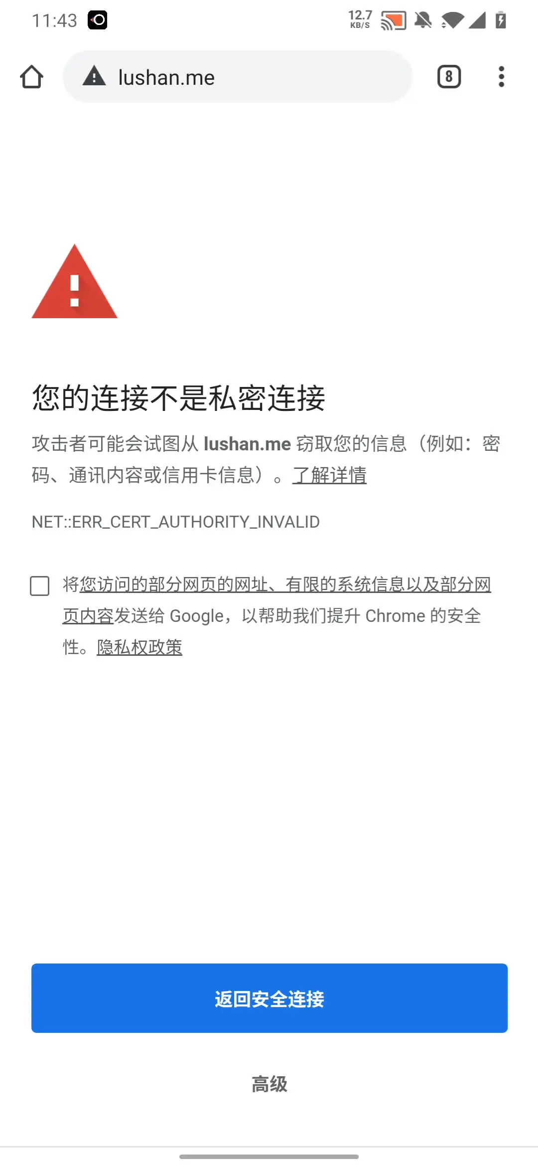 先不安装 charles 的证书,在Android的浏览器访问一下我的博客,看一下情况