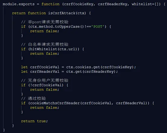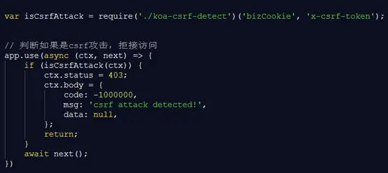 这里我们选用了koa2,将判断逻辑抽象成一个函数,返回true时代表截获到了CSRF攻击。