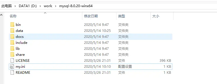 basedir设置为自己的MySQL安装目录[mysql] # 设置mysql客户端默认字符集 default-character-set=utf8 [mysqld] #设置3306端口 port = 3306 # 设置mysql的安装目录 basedir=D:\work\mysql-8.0.20-winx64 # 允许最大连接数 max_connections=200 # 服务端使用的字符集默认为8比特编码的latin1字符集 character-set-server=utf8 # 创建新表时将使用的默认存储引擎 default-storage-engine=INNODB