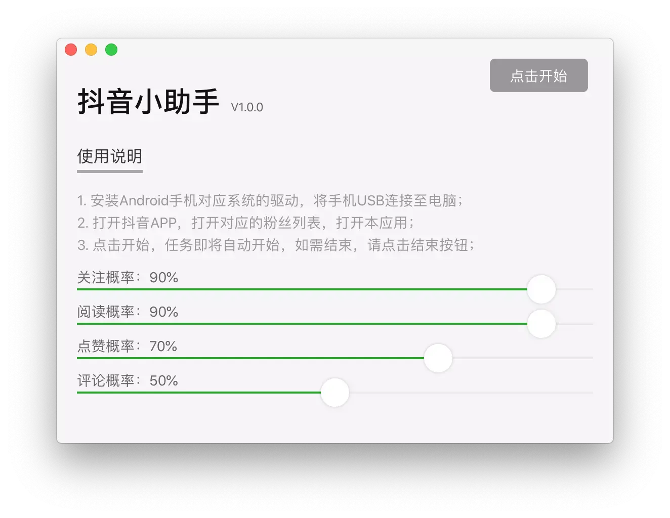抖音小助手,使用ADB完成抖音APP的自动化操作,支持自定义评论、点赞、刷抖音、关注用户等系列操作。