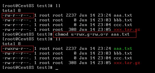 示例:修改/test下的aaa.txt的权限为属主有全部权限,属主所在的组有读写权限, 其他用户只有读的权限