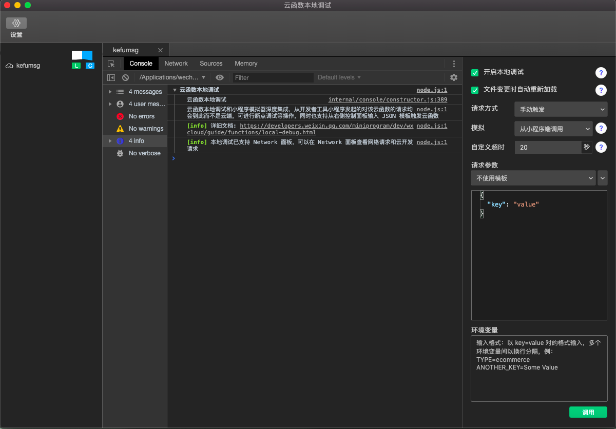 每次开发完都要提交部署,一旦网速慢我很反感受不了。这时可以利用云函数本地调试功能。在kefumsg云函数的目录右键,选择开启云函数本地调试,由于使用npm包wx-server-sdk(云函数的运行环境是 Node.js,因此在本地安装依赖时务必保证已安装 Node.js),需要在该目录执行终端命令安装依赖包yarn install,否则会报错,安装完成会打开窗口:
